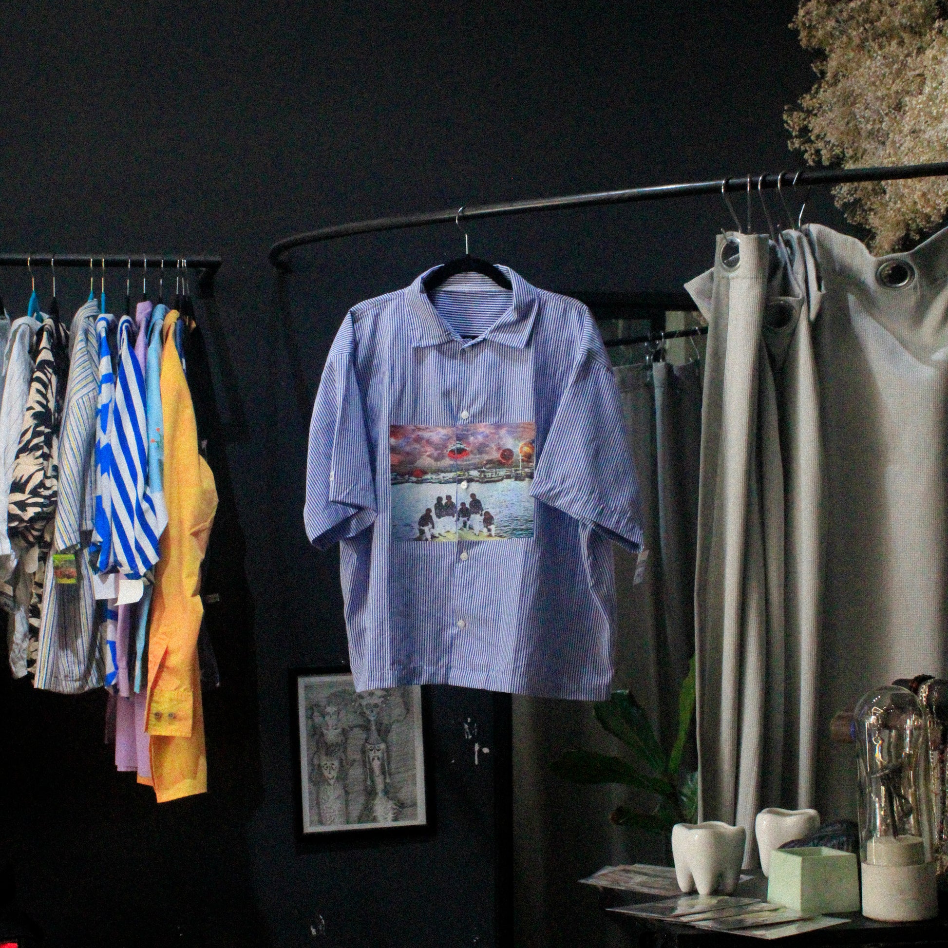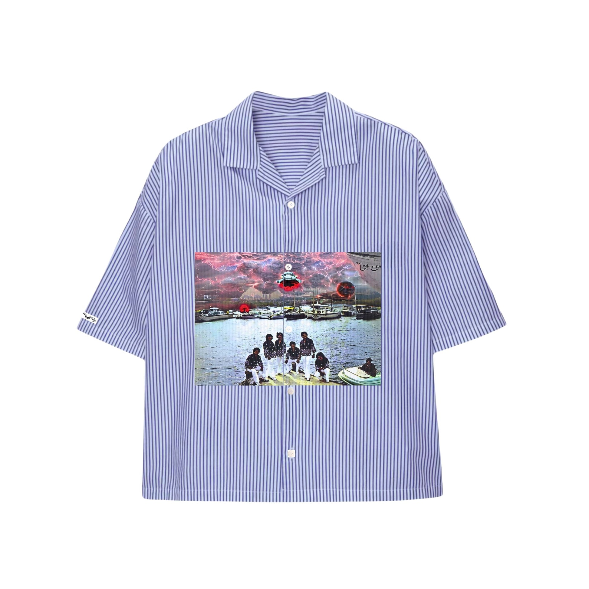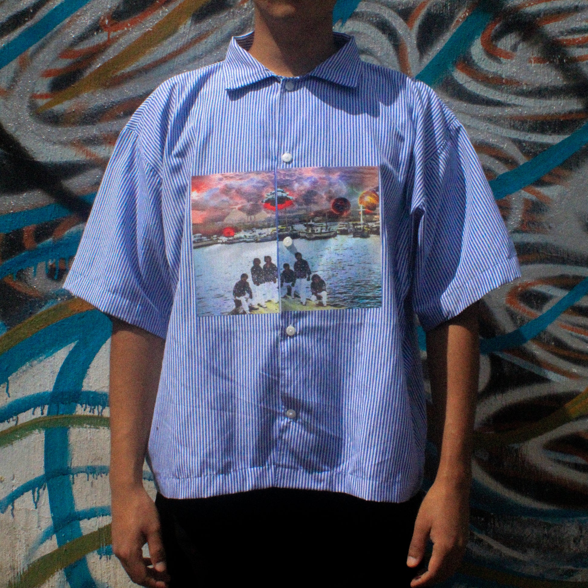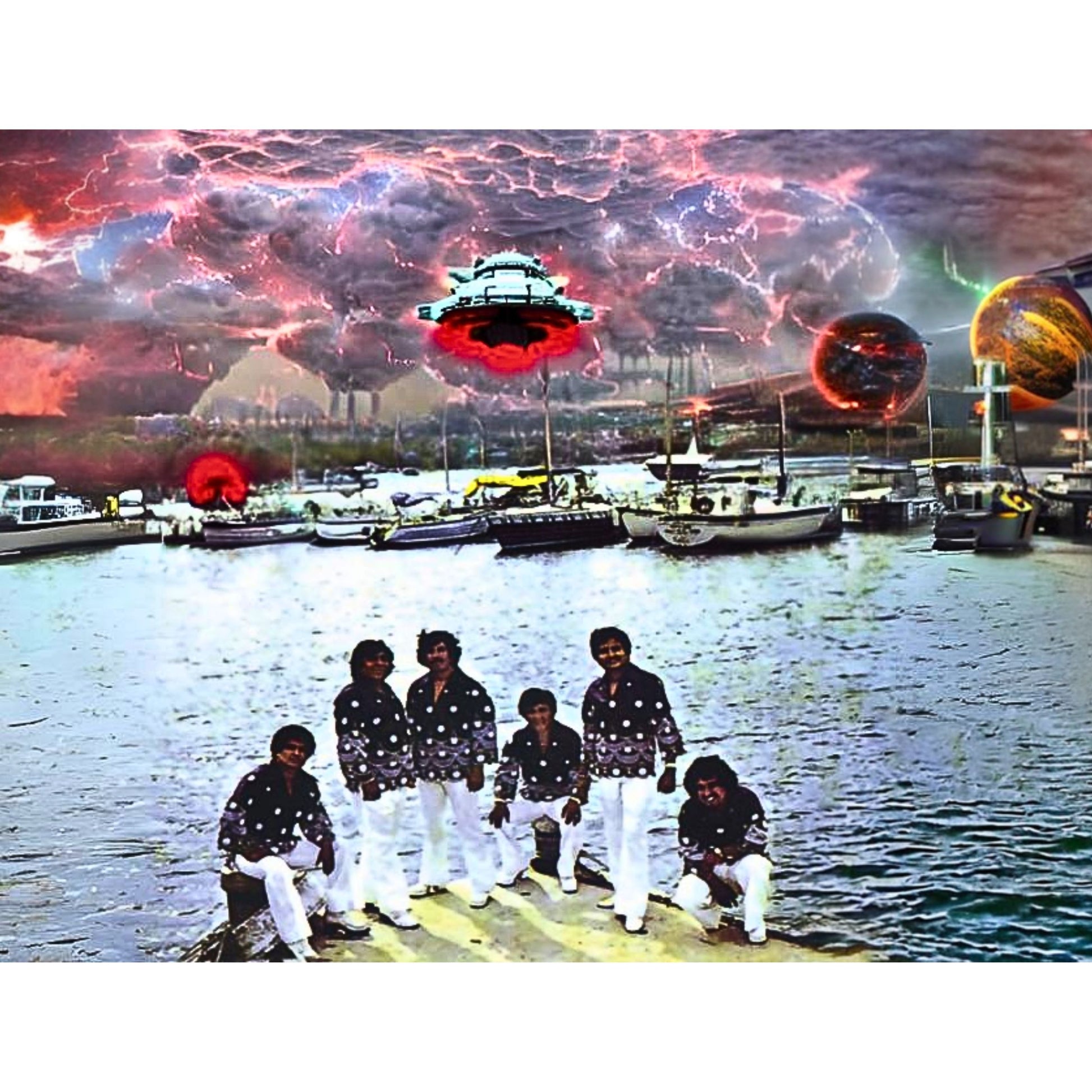 - Sublimación textil al centro con imagen de los integrantes de Acapulco Tropical siendo invadidos por inquietantes naves voladoras