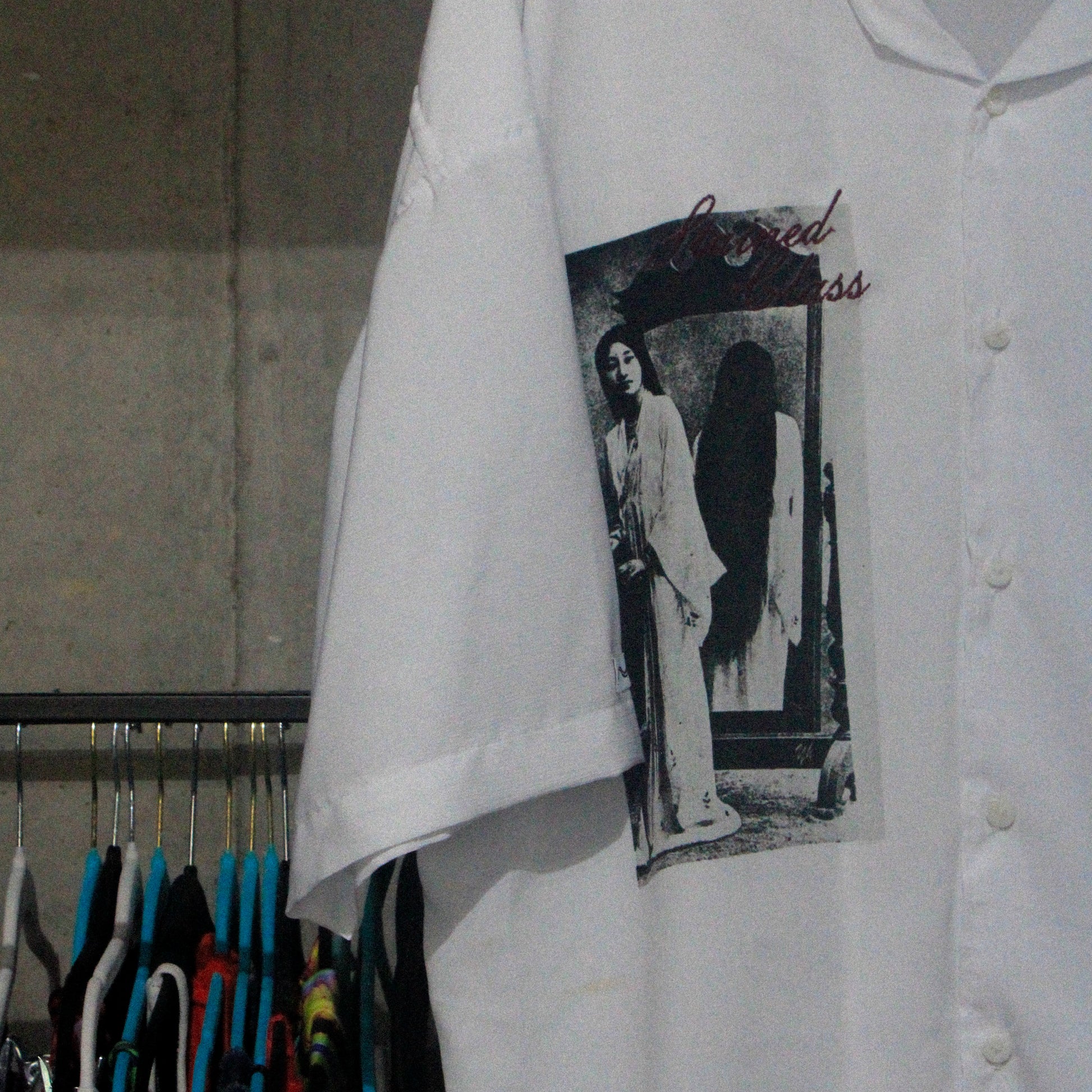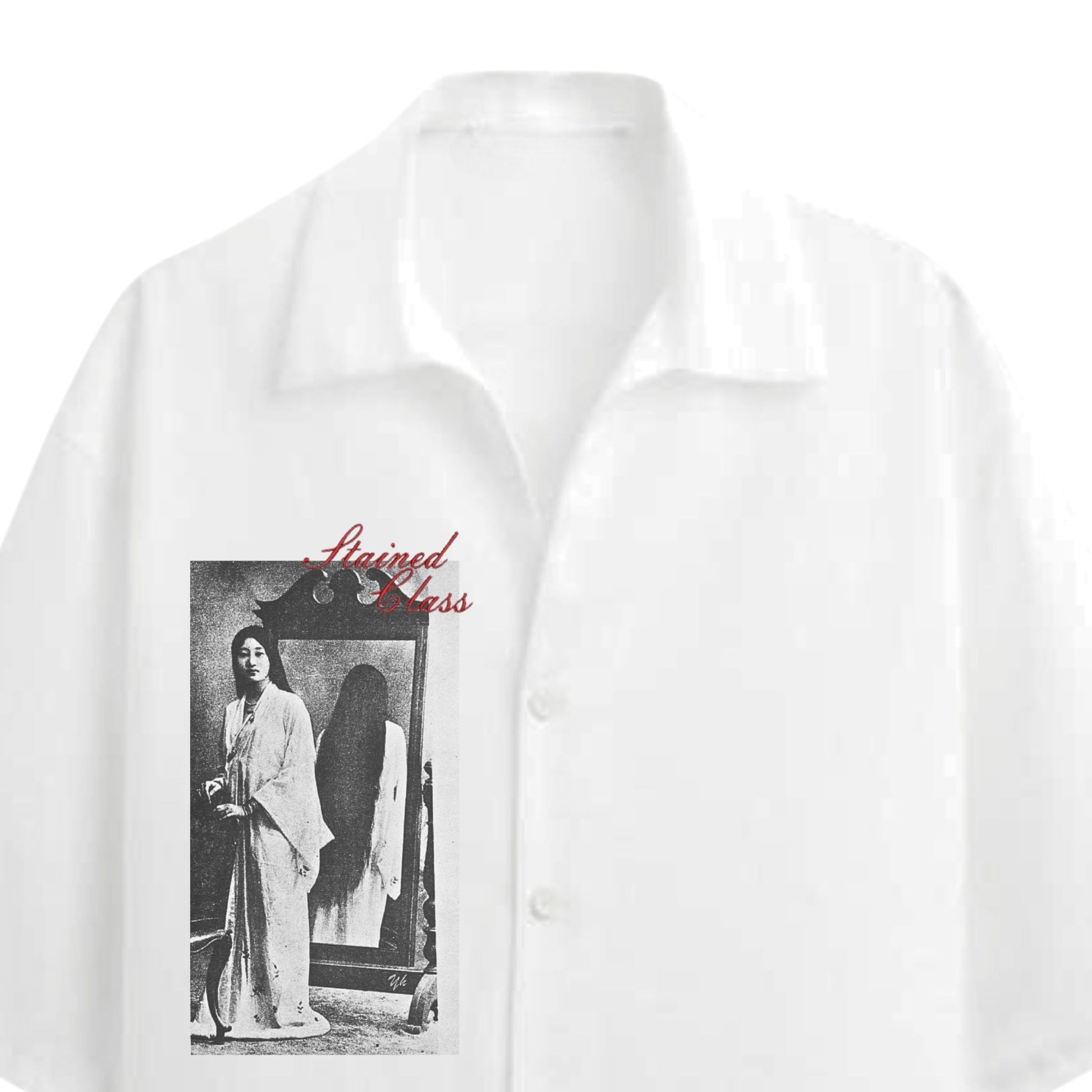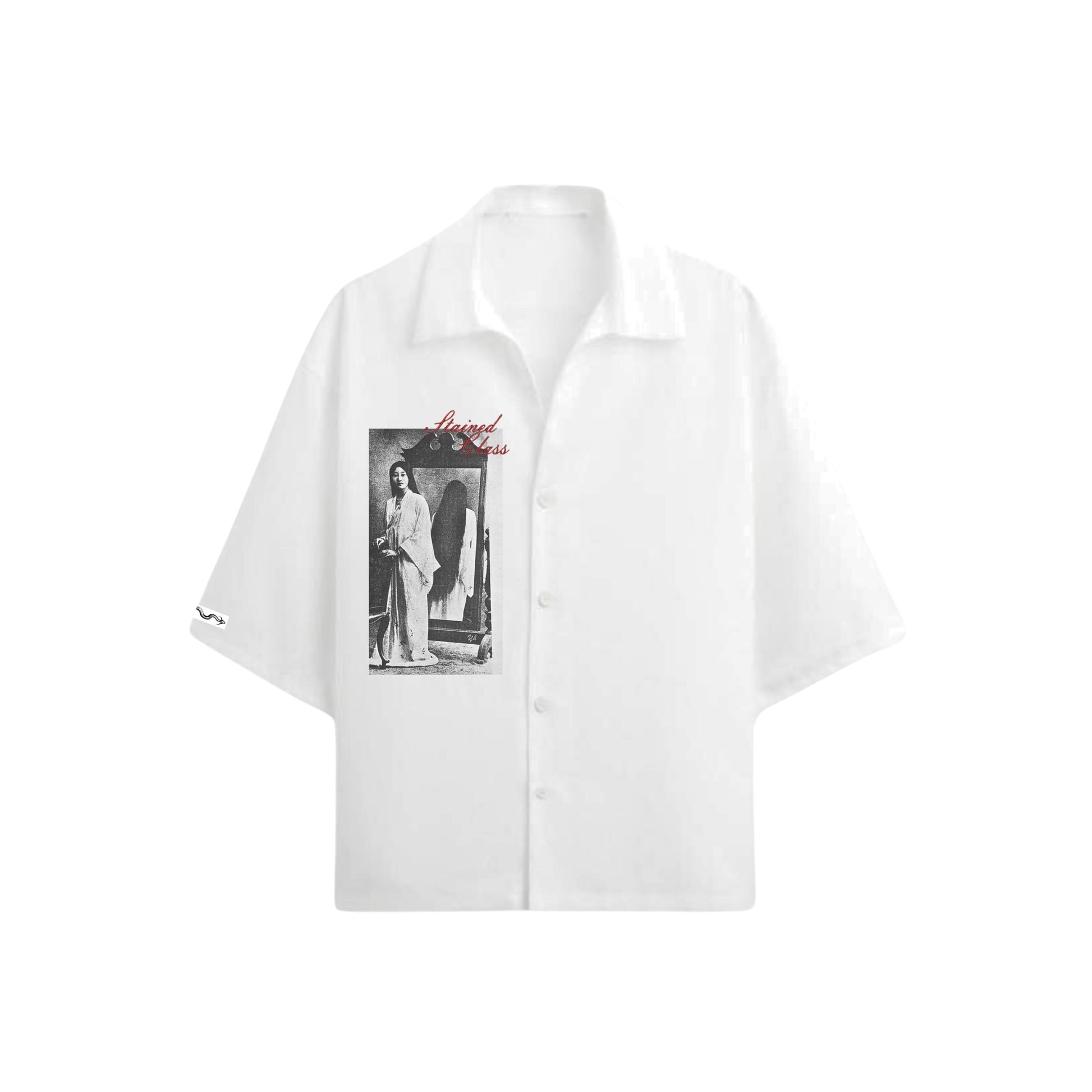 - Sublimación textil directa y letras color tinto bordadas ("Stained Class") a un costado